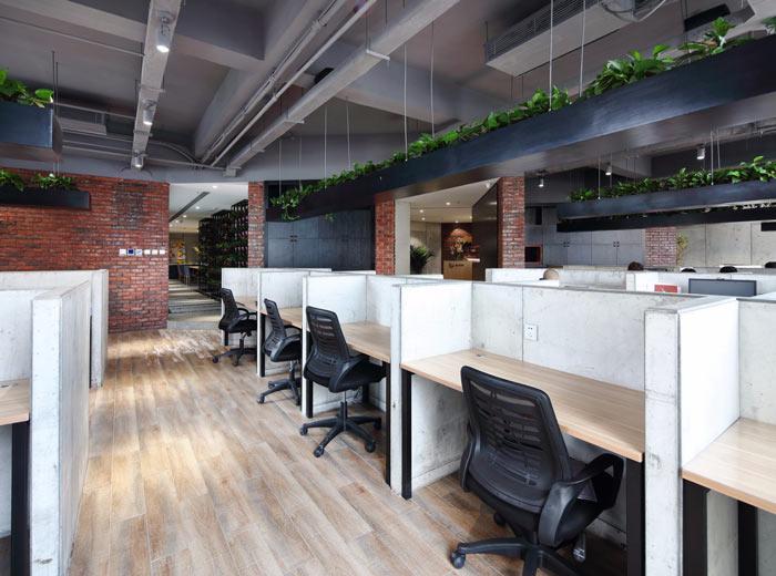 設計公司辦公室綠植設計:隔斷與綠植結合在一起,也是本次辦公室設計的亮點之一,此處一來可以凈化整個空間的空氣,二來可以讓員工在這里暫時忘卻煩惱