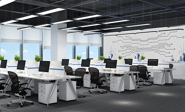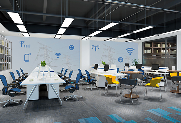 在采光方面,也加強了自然光的利用,人工照明也力求舒適柔和不刺眼目。在辦公空間設計的配色上,以黑白藍為主色,以簡潔、完美的造型給人們帶來精神上的享受,辦公室設計出來的整體效果要給人一種明亮、青春、充滿活力特性。