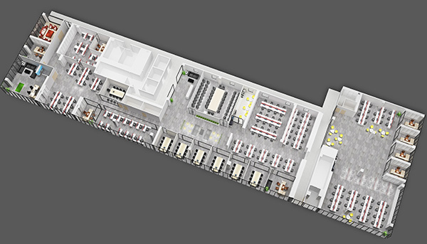 設計師從建筑空間形態出發,充分挖掘和提升其價值,著重分析各個空間的體塊關系,通過大面切割的收發突破整齊劃一的空間規律,使之隔而不斷,產生獨特的節奏和韻律,從而打造了一個兼具科技感與時尚感的辦公空間。