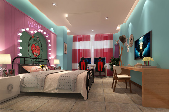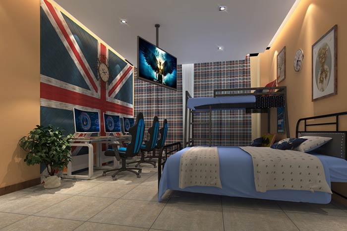 電競酒店客房設計:客房的設計不是千篇一律,而是各有特色,這樣的目的就是為了更大范圍的貼合客戶的需求,娛樂、舒適與一體,是設計師設計的重點。