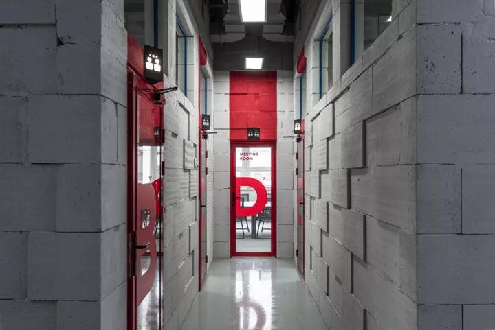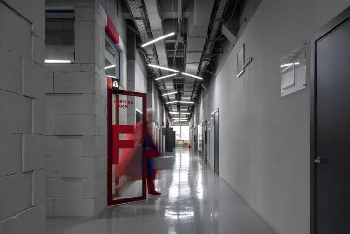 灰色環氧樹脂地坪漆、灰色的水泥墻面、灰色噴涂的頂面構造、以及灰色砌塊墻體,整個空間統一在寧靜的淺灰色調中,以紅色企業色來點亮一個個空間,賦予每個區域各自不同的劇情故事。